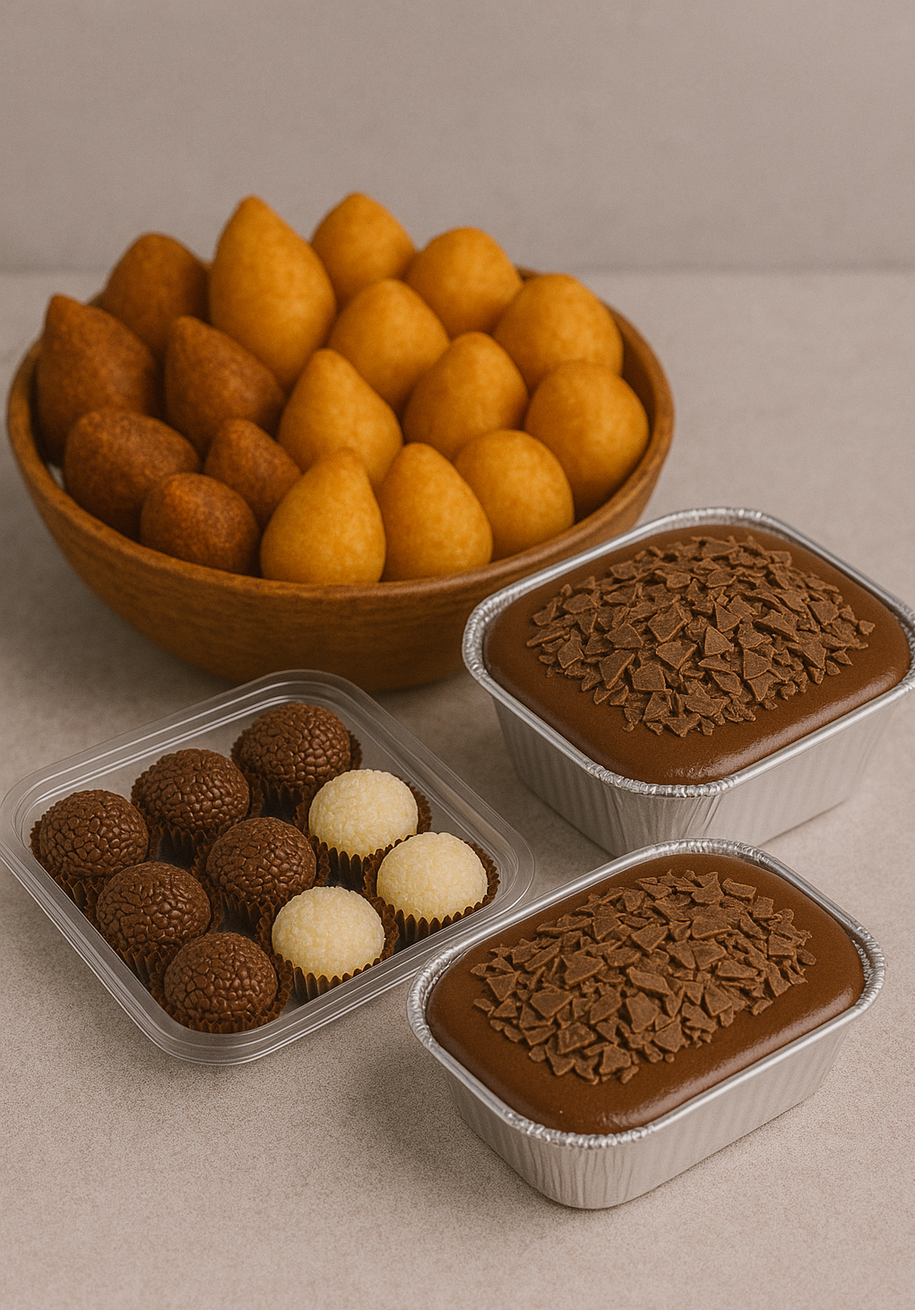 Kit Festas Casal* 30 Salgados + 10 Docinhos Gourmet + 1 Bolo na Marmita